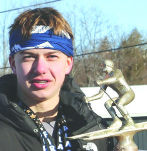 - Lake Skytta poses with the trophy for being one of the overall winners of the 2026 Rumney Memorial award after a youth alpine ski meet held Saturday at Marquette Mountain. (Photo courtesy Julie Kelly)