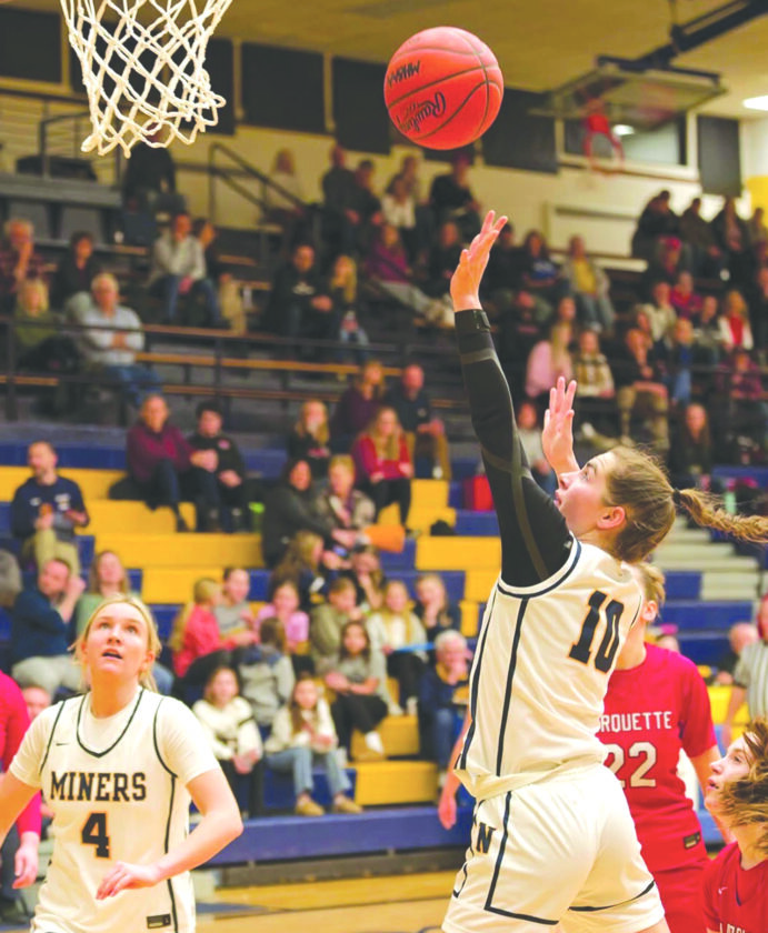 - Negaunee’s Sadie Rogers, right, takes a shot with teammate Paige O’Donnell watching the action during a high school girls basketball game played against Marquette at Lakeview Memorial Gymnasium in Negaunee on Friday. (Photo courtesy Roundballin/Tony Pelletier)