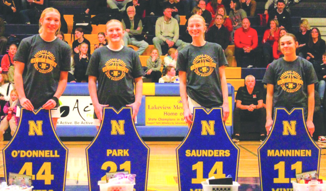 - Negaunee High School’s four seniors on its girls basketball team were honored on Senior Night before a home game played against Marquette at Lakeview Memorial Gymnasium on Friday. From left are Clare O’Donnell, Aleana Park, Liliana Saunders and Kayleigh Manninen. (Photo courtesy Delaney Gladwell)