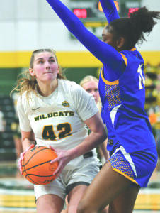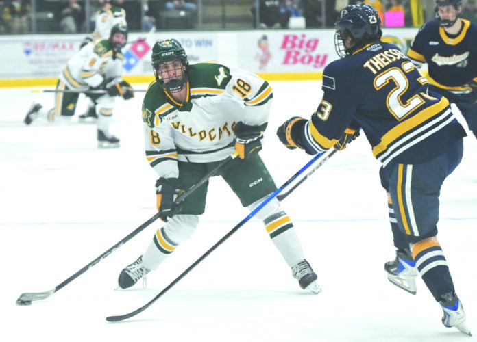 Then with 10 seconds left in the opening period, the Wildcats evened the score when leading scorer Caiden Gault played a long cross-ice stretch pass to Kyle Bettens streaking down the right boards. Bettens used his speed to beat a defender and walk in on the breakaway, shooting to the backhand for a 1-1 tie on his first goal of the season.