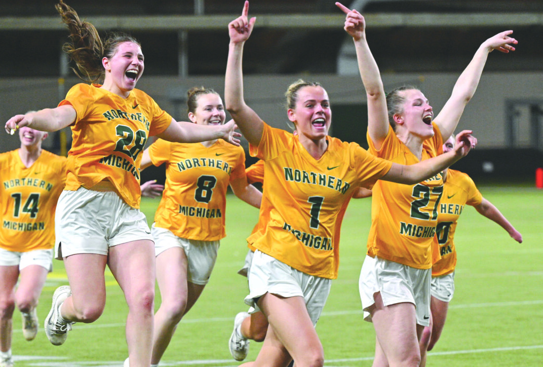 Northern Michigan University players, including leading goal scorer Josie Lakosky, No. 1 at center, celebrate their win after a GLIAC game played against Concordia-St. Paul at the Superior Dome in Marquette on April 26. (Photo courtesy Cara Kamps)