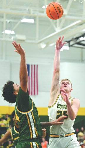 Northern Michigan University’s Dylan Kuehl, right, makes this jumper during a GLIAC game played against Wayne State at Vandament Arena in Marquette on Jan. 24. (Photo courtesy Cara Kamps)