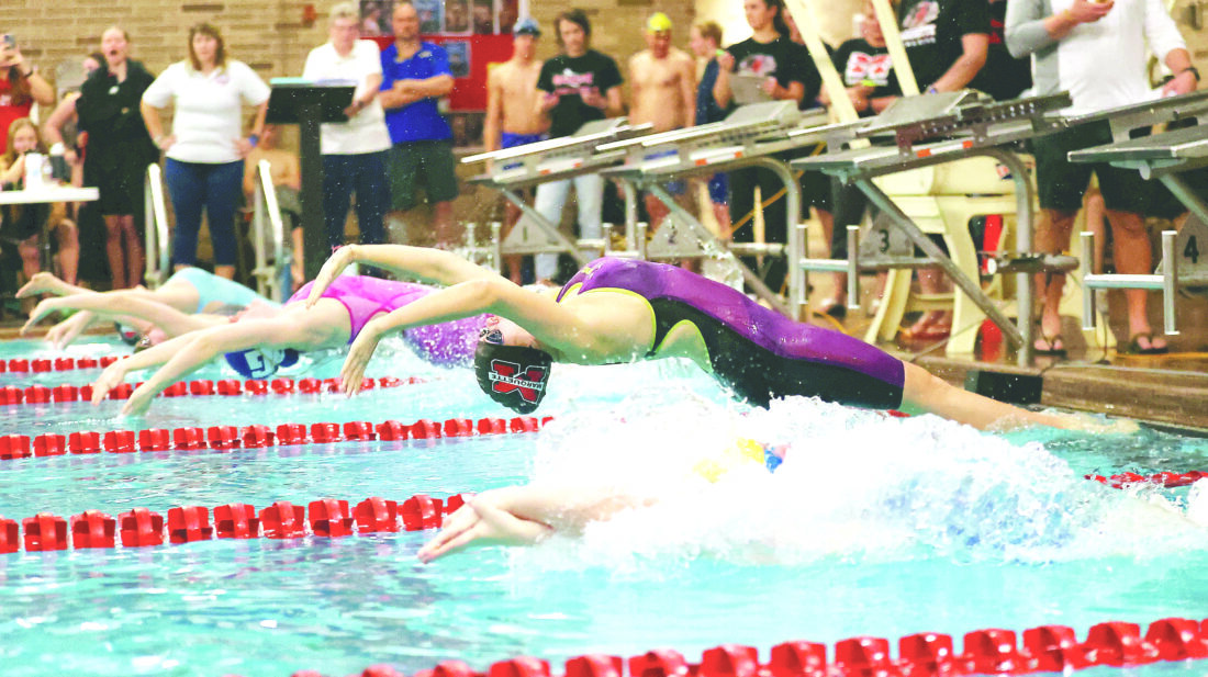 Marquette’s Logan McFarren, front in purple-and-black suit, joins the other swimmers coming off the blocks to start the girls’ 100-yard backstroke during the MHSAA Upper Peninsula Finals in held at Marquette Senior High School on Feb. 15, 2025. McFarren finished runner-up in this event. (Photo courtesy Daryl T. Jarvinen)