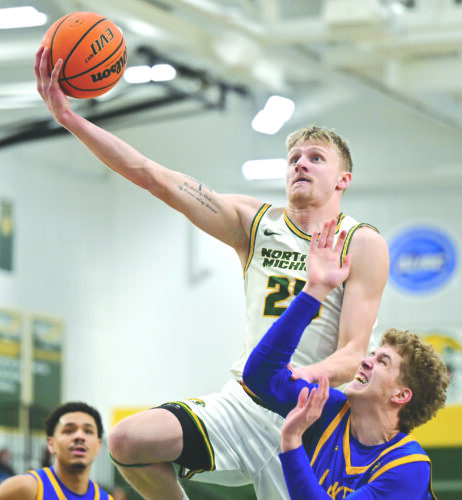 Northern Michigan University’s Dylan Kuehl, top, goes up a shot against Lake Superior State’s Karter Richards during their GLIAC basketball game played at Vandament Arena in Marquette on Feb. 7. (Photo courtesy Cara Kamps)
