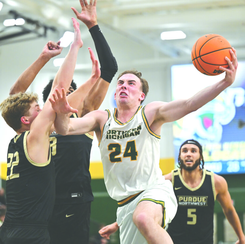 Northern Michigan University’s Bennett Basich, center, goes up for a shot against a pair of defenders during a GLIAC men’s basketball game played against Purdue Northwest at Vandament Arena in Marquette on Jan. 22. (Photo courtesy Cara Kamps)