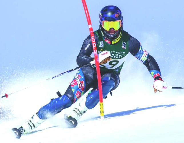 Northern Michigan University men’s alpine skier Reed Heathman rounds a gate during a past Wildcats’ meet. (Photo courtesy NMU)