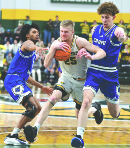 - Northern Michigan University’s Dylan Kuehl, center, drives between Grand Valley State’s David Wilkerson, left, and Jalen Charity as he takes it to the net to score two points during the GLIAC Tournament championship game played at Vandament Arena in Marquette on March 8. (Photo courtesy Cara Kamps)