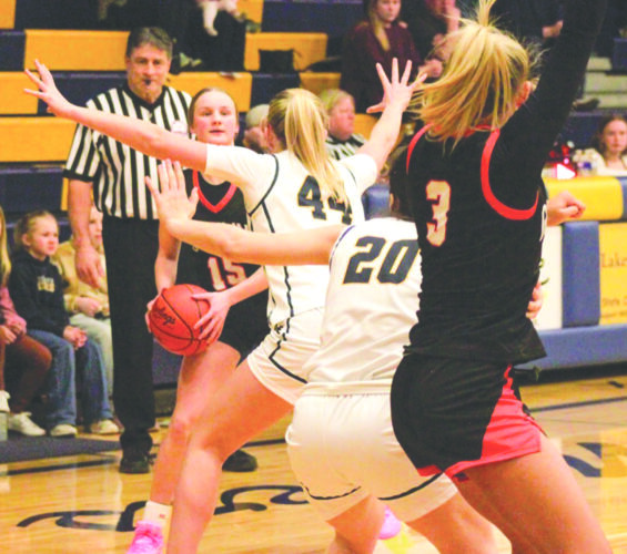 From left, Houghton’s Romi Mattson tries to inbound the ball against Negaunee defenders Clare O’Donnell and Keira Waterman as the Gremlins’ Ellie Hainault tries to get in position to receive the throw during their MHSAA Division 2 district tournament game played at Lakeview Memorial Gymnasium in Negaunee on Wednesday. (Photo courtesy Negaunee High School student Delaney Gladwell)