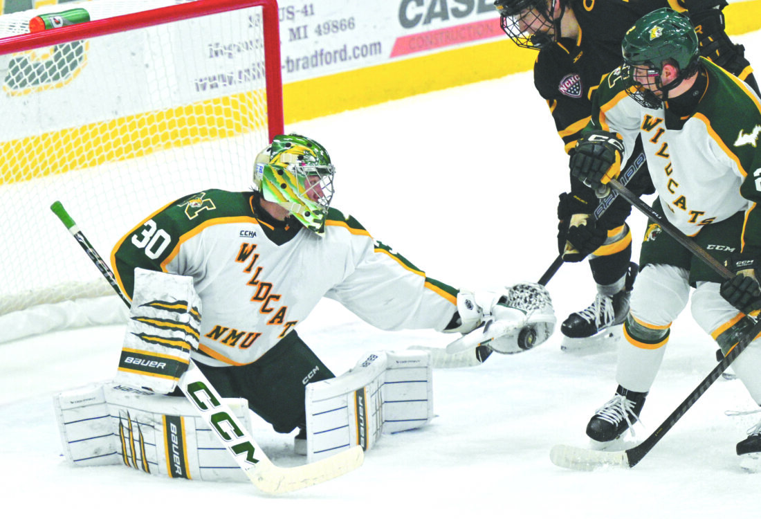 Northern Michigan University goaltender Oliver Auyeung-Ashton, left, gets a glove on a Colorado College shot with Wildcats’ defenseman Joe Schiller, right, in on the play during their game played at the Berry Events Center in Marquette on Oct. 17. (Photo courtesy Cara Kamps)