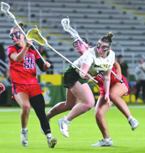 Northern Michigan University’s Emily Radke, right, scores on this shot during a GLIAC women’s lacrosse game played against Saginaw Valley State at the Superior Dome in Marquette last Friday. (Photo courtesy Cara Kamps)