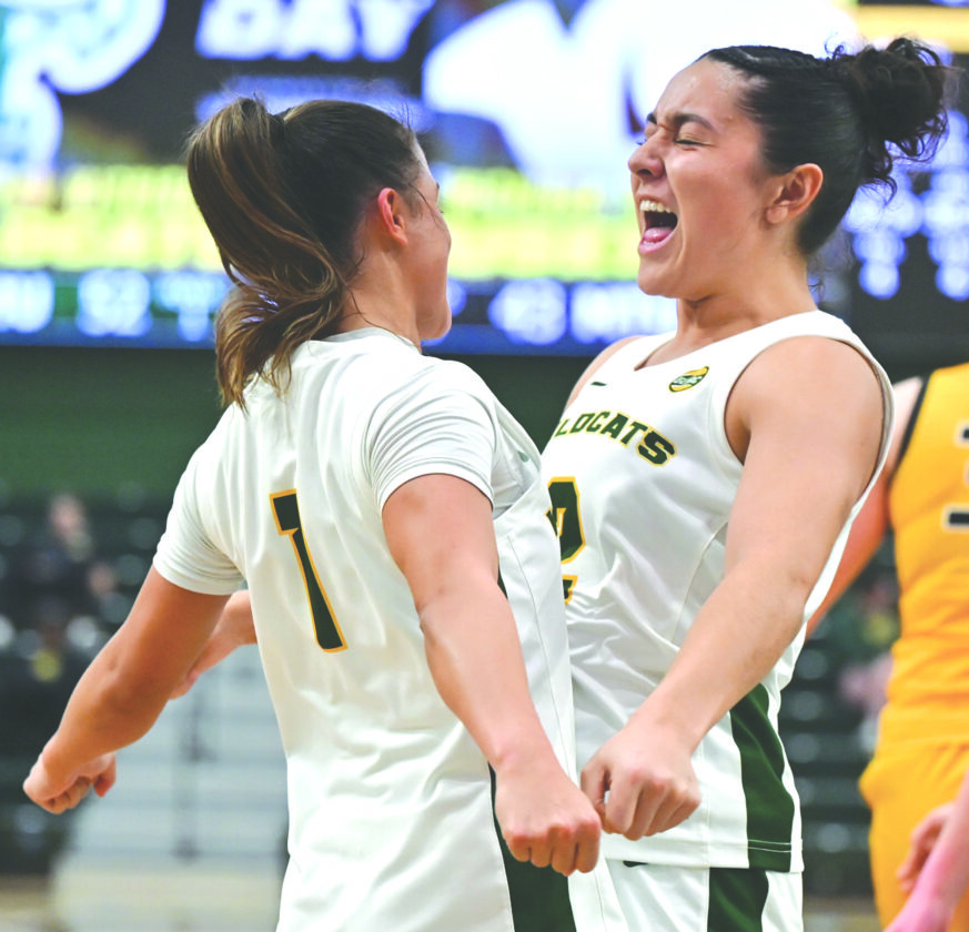 Northern Michigan University’s Sydney Whitehouse, right, celebrates with teammate CJ Romero for scoring two points just before the buzzer to end the third quarter during a GLIAC Tournament quarterfinal women’s game played against Michigan Tech at Vandament Arena in Marquette on Wednesday. (Photo courtesy Cara Kamps)