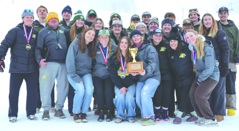 The men’s and women’s alpine ski teams at Northern Michigan University show off some of their hardware, including individual medals, they earned as both won championships at the U.S. Collegiate Ski & Snowboard Association regional meet held at Marquette Mountain on Feb. 14-15. (Photo courtesy NMU)
