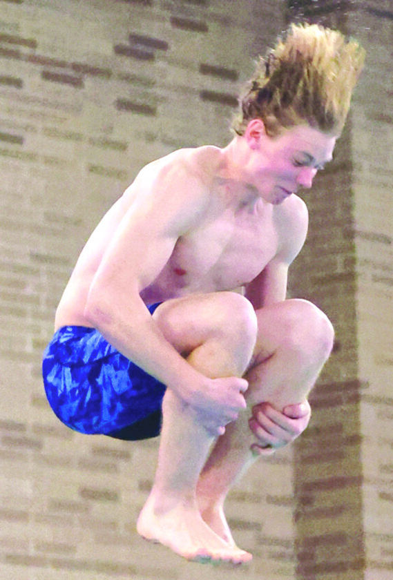 Ishpeming-Negaunee’s Mateusz Wozniak performs a dive during the MHSAA Upper Peninsula Finals in boys swimming and diving held at Marquette Senior High School on Feb. 21. (Photo courtesy of Daryl T. Jarvinen)
