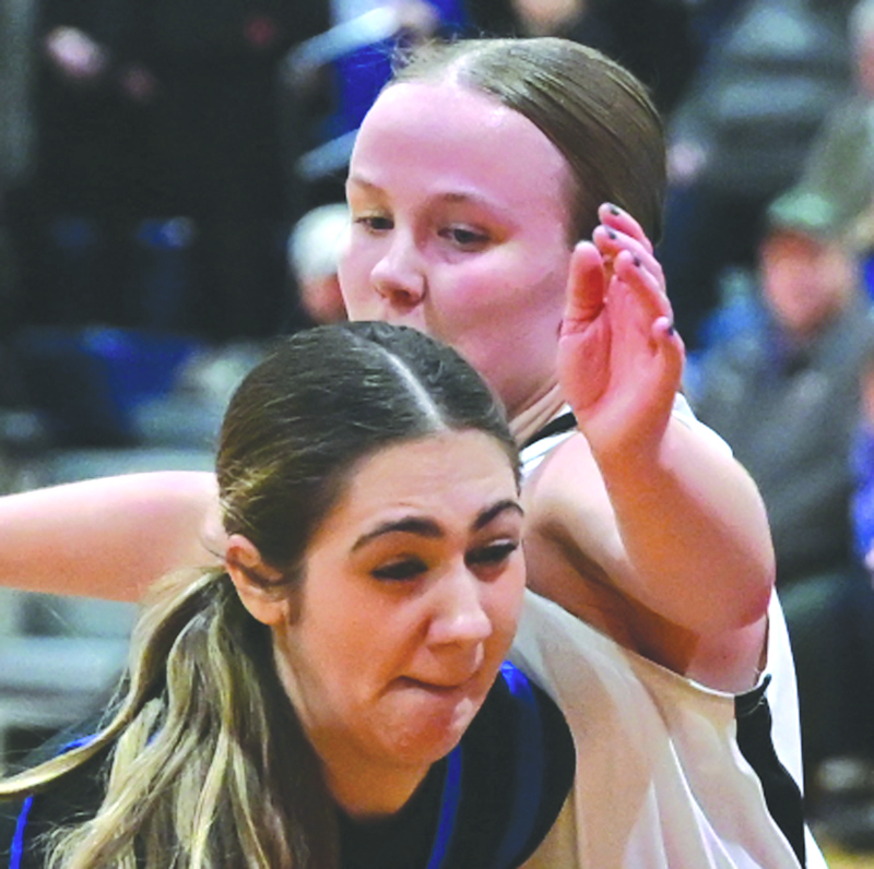 Ishpeming's Brittanie Piotrowski, below, drives to the lane while defended by Ewen-Trout Creek's Emma Besonen during their MHSAA Division 4 regional championship girls basketball game played at Westwood High School in Ishpeming on Wednesday. (Photo courtesy Cara Kamps)