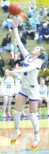 Ishpeming’s Mya Hemmer puts up this successful shot from the paint during an MHSAA Division 4 quarterfinal girls basketball game played against Indian River Inland Lakes in Gaylord on Wednesday. (Photo courtesy Ben Murphy)