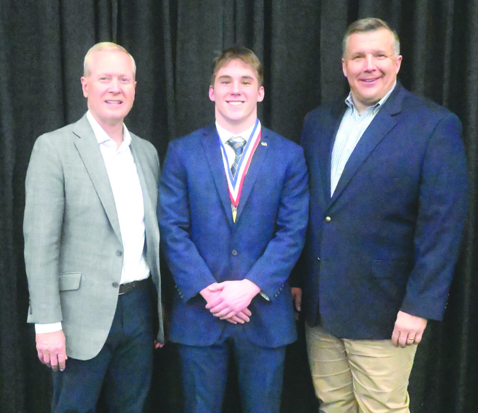 Gavin Comero, center, of Westwood High School was one of three Upper Peninsula high school students honored as a recipient of a Scholar-Athlete Award from the MHSAA and Farm Bureau Insurance at the state group’s boys basketball state championship games played Saturday at the Breslin Center on the campus of Michigan State University in East Lansing. Flanking Comero at left is Don Simon, Farm Bureau chief executive officer, and at right, Mark Uyl, MHSAA executive director. (Photo courtesy MHSAA)