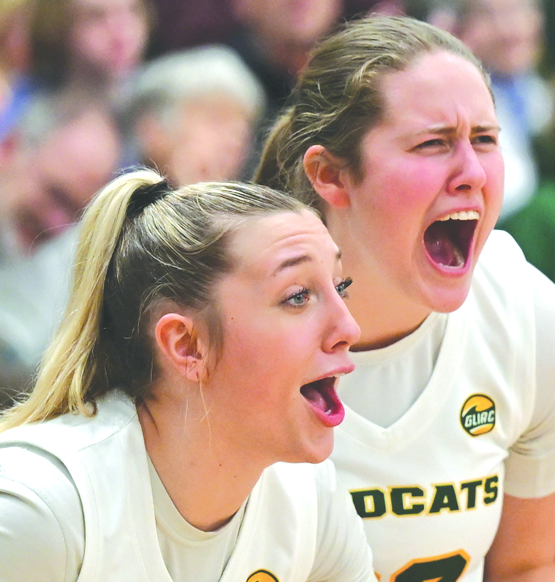 - While on the bench, Elsa Bachert, left, and Ava Bates of the Northern Michigan University women’s basketball team react to teammate Jacy Weisbrod making a drive through the lane and scoring against Wisconsin-Parkside at Vandament Arena in Marquette on Saturday. (Photo courtesy Cara Kamps)
