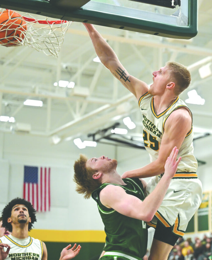 Northern Michigan University’s Dylan Kuehl gets his fifth and final dunk of the afternoon during a GLIAC game played against Wisconsin-Parkside on Feb. 28 at Vandament Arena in Marquette. (Photo courtesy Cara Kamps)