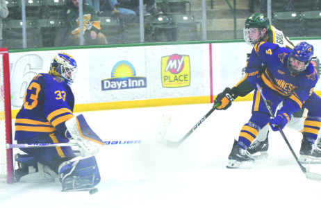 Northern Michigan University’s Josie Lakosky, right, takes a penalty shot and would score during a college lacrosse game played against Lewis University at the Superior Dome in Marquette on Thursday. (Photo courtesy Cara Kamps)