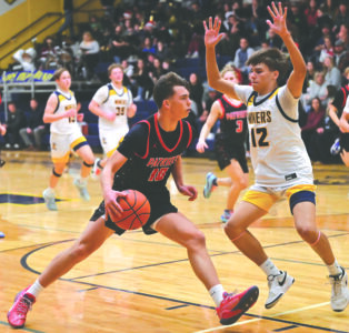 - Westwood’s Ethan Marta looks for a lane to drive in during a high school boys basketball game played against Ishpeming at the Patriots’ gym in Ishpeming on Feb. 4. (Photo courtesy Cara Kamps)
