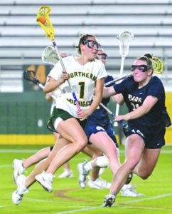 - Northern Michigan University’s Josie Lakosky, left, heads for the net while defended closely by Concordia-St. Paul’s Ruby Swenson during their GLIAC lacrosse match played at the Superior Dome in Marquette on Saturday. (Photo courtesy Cara Kamps)