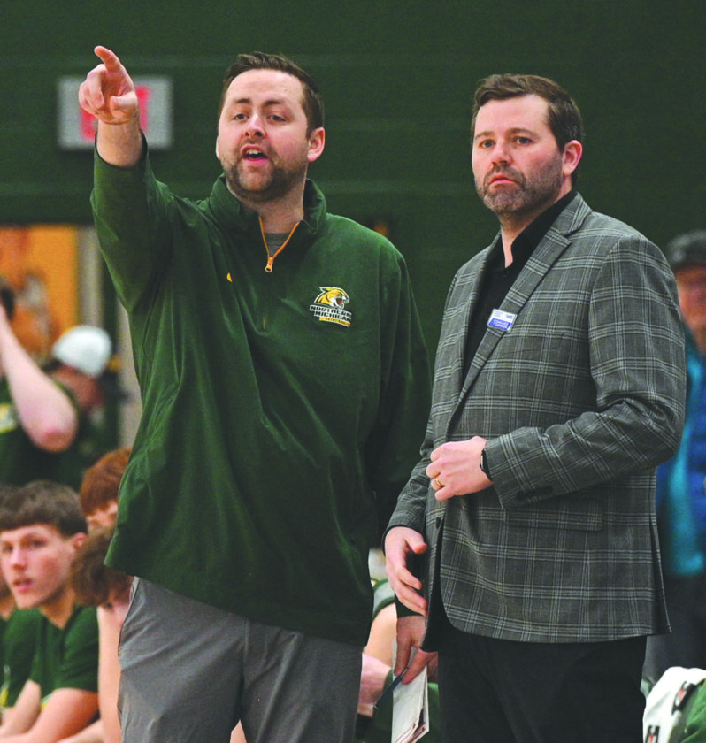 - Northern Michigan University assistant coach Keil Ganz, left, and head coach Matt Majkrazak watch the Wildcats during a GLIAC men’s basketball game played against Davenport at Vandament Arena in Marquette on Feb. 1, 2025. (Photo courtesy Cara Kamps)