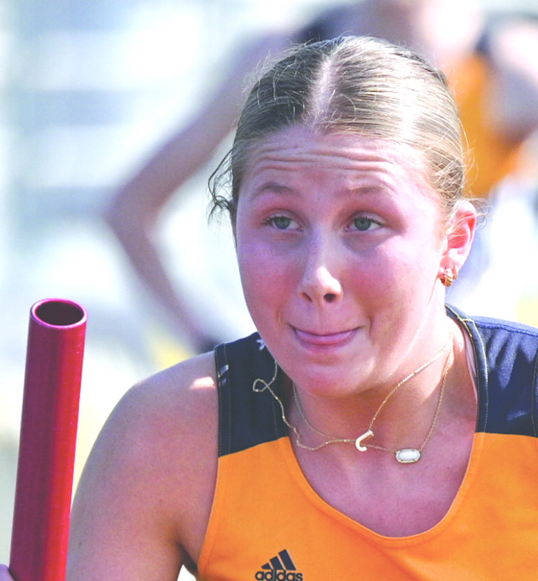Negaunee's Macyn Dellangelo takes off out of the blocks to begin the girls’ 800-meter relay high school track and field meet held at the Miners’ track in Negaunee on April 23, 2025. (Photo courtesy Cara Kamps)