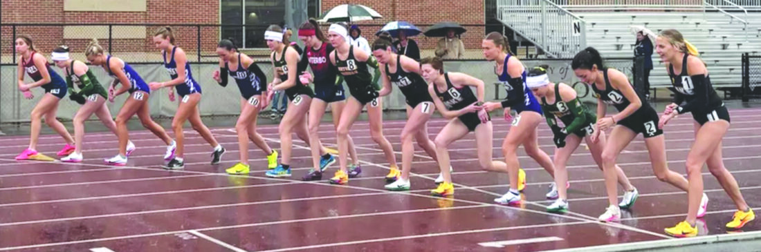 Runners from at least four schools, including Northern Michigan University, line up in rainy conditions for the start of the women’s 5,000-meter run at the Ashton May Invitational held at the University of Wisconsin-La Crosse on Friday. The four Wildcats taking part are each of the runners wearing a white headband. From left are NMU’s Ashley Choponis, Madalyn Agren, Madi Szymanski and Sophia Potter. (Photo courtesy NMU)