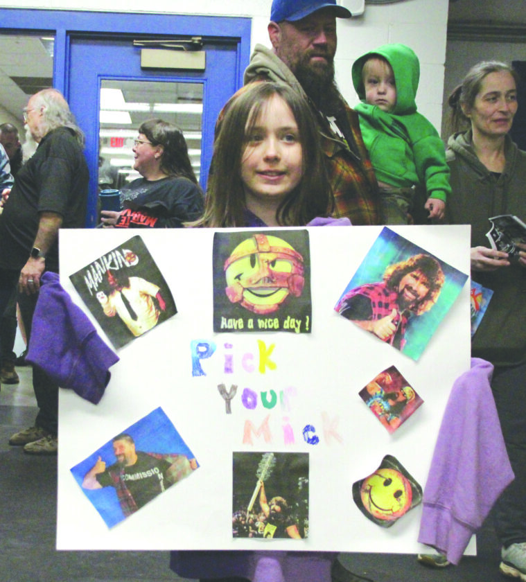 - Dahlai Koepp, 8, of Marquette holds up her Mick Foley fan sign in anticipation of MarquetteMania IV held at Lakeview Arena in Marquette on Saturday. (Journal photo by Justin Marietti)