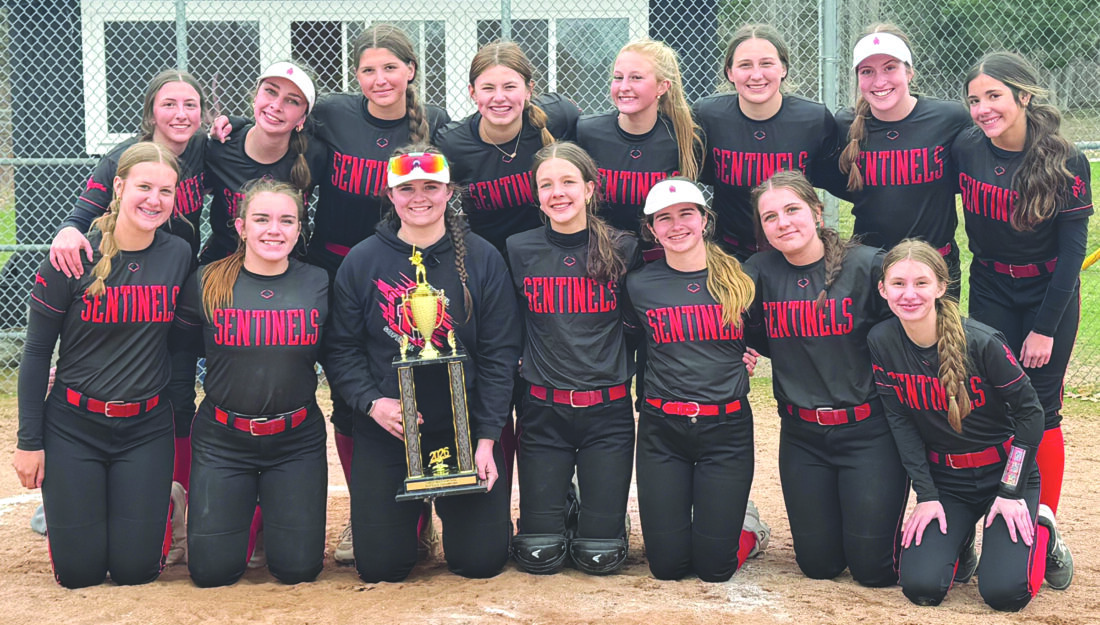 The Marquette Senior High School softball team poses with its championship trophy after winning the Laker Invitational held in Maple City and hosted by Glen Lake High School on Saturday. The Sentinels won both their games in five innings, defeating Norway 11-0 and host Glen Lake 20-11. (Photo courtesy Dana Swajanen)