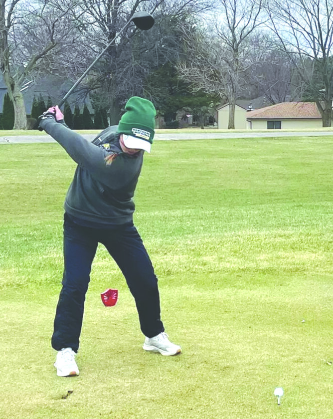 Northern Michigan University’s Abbie Pietila tees off while bundled up at the rain-shortened Upper Iowa University Invitational held in Waterloo, Iowa, on Saturday. (Photo courtesy NMU)