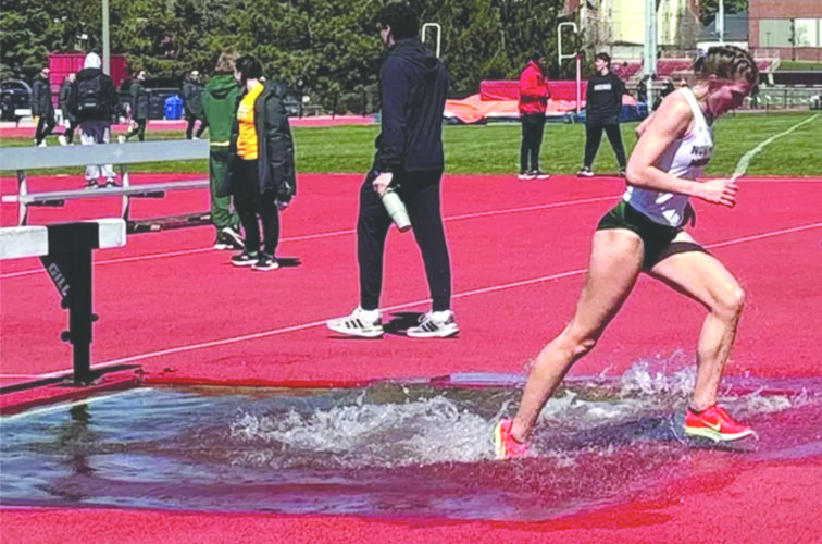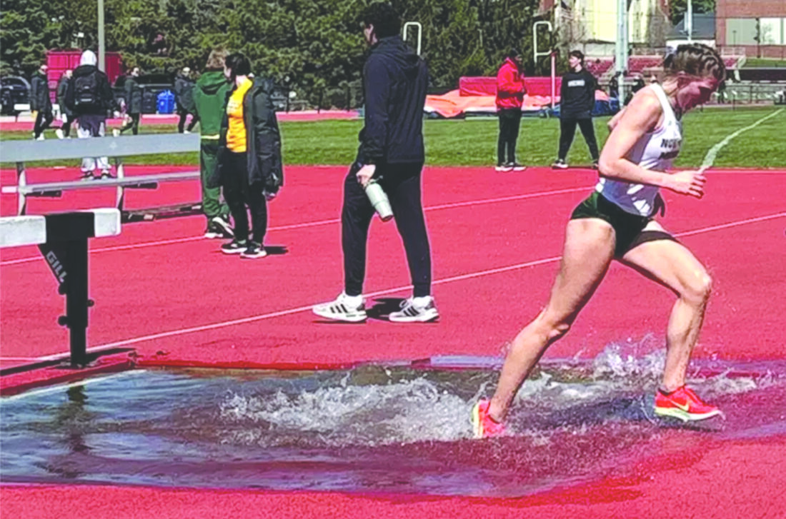 Northern Michigan University’s Dani Van Lente makes a splash after coming over a hurdle and into a water hazard during the 3,000-meter steeplechase at the Leopard Invitational held in La Verne, Calif., last Saturday. (Photo courtesy NMU)