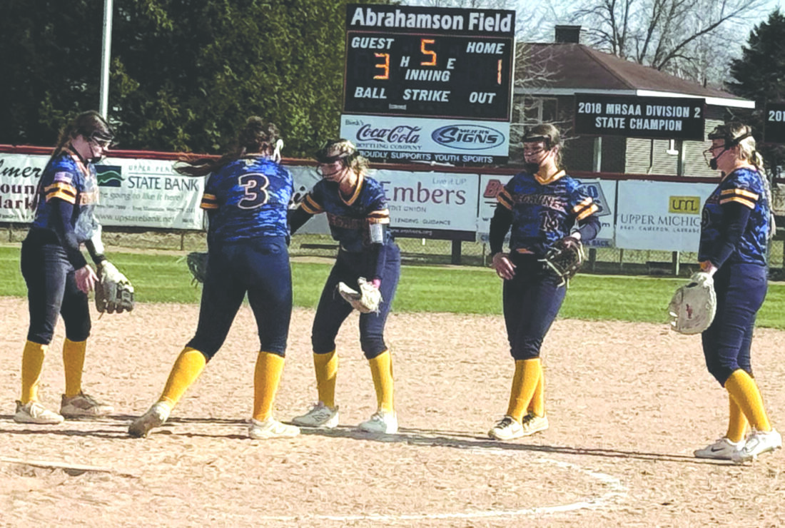 Negaunee infielders have a conference at the pitching rubber during the first game of a high school softball doubleheader played in Escanaba on Thursday. From left are third baseman Megan Marker, pitcher Aly Robar, shortstop Liv Richards, second baseman Brielle Anderson and first baseman Cassie Feys. (Photo courtesy Steph Robar)