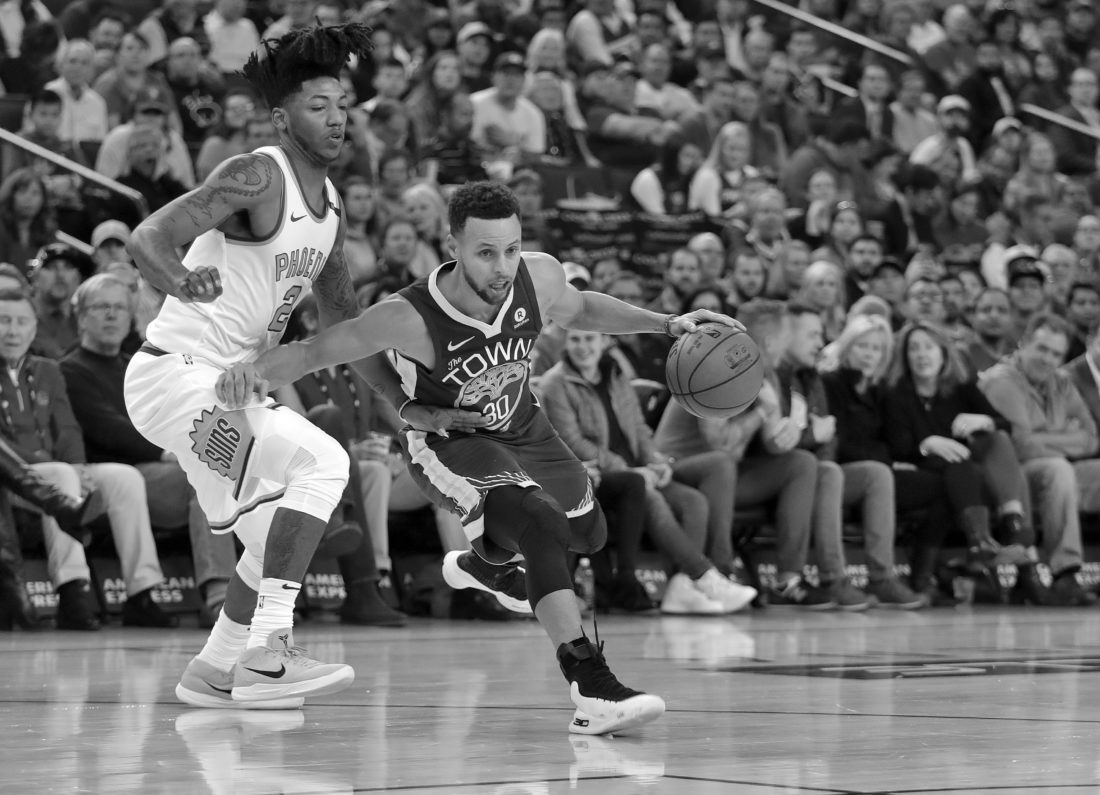 Golden State Warriors guard Stephen Curry, right, dribbles past Phoenix Suns' Elfrid Payton during the first half of an NBA basketball game Monday, Feb. 12, 2018, in Oakland, Calif. (AP Photo/Marcio Jose Sanchez)