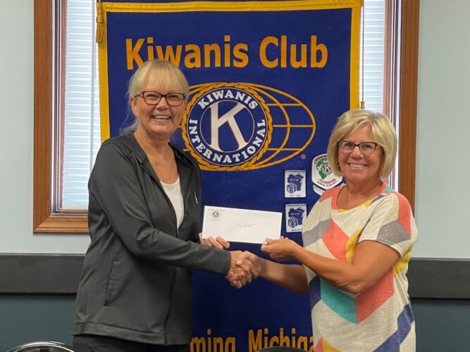 Clare Lutgen, the Executive Director of Bay Cliff (left) accepts a donation from the treasurer of the Kiwanis Club of Ishpeming, Cheryl Sleeman at a recent meeting of the Club. Bay Cliff is just one of the many local organizations supported by the Kiwanis Club.