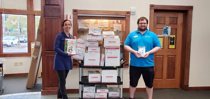 Library Director Jessica Holman, left, presents Jean Dagesse with summer reading prizes at the Negaunee Public Library. Dagesse won a canvas bag from the library, coupons for pasties from Irontown Pasties and hair care products from Be”you”tiful Salon. The summer reading program ran through ...