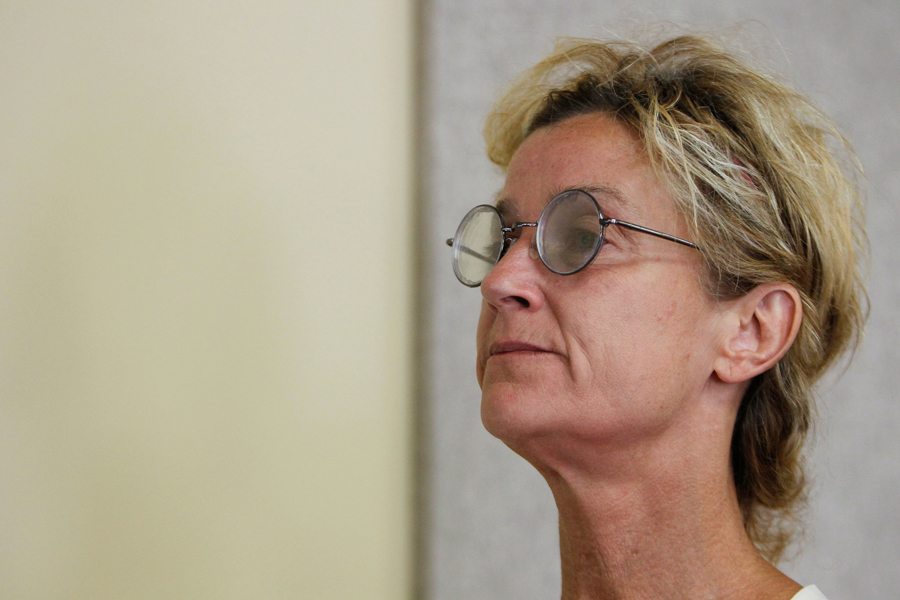 In this Aug. 10, 2017 photo, Det. Sgt. Maureen Kennedy, a 30-year veteran of the MSU Police Department, works on a therapy session at Origami Brain Injury Rehabilitation Center in Mason, Mich.. She wears a pair of glasses that help correct the midline shift in her vision due to a car accident. (Matthew Dae Smith/Lansing State Journal via AP)