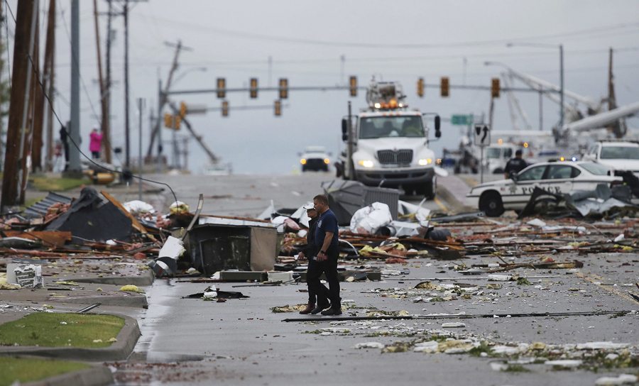 Debris from a storm covers a street in Tulsa, Okla., Sunday, Aug. 6, 2017. A possible tornado struck near midtown Tulsa and causing power outages and roof damage to businesses. (Tom Gilbert/Tulsa World via AP)