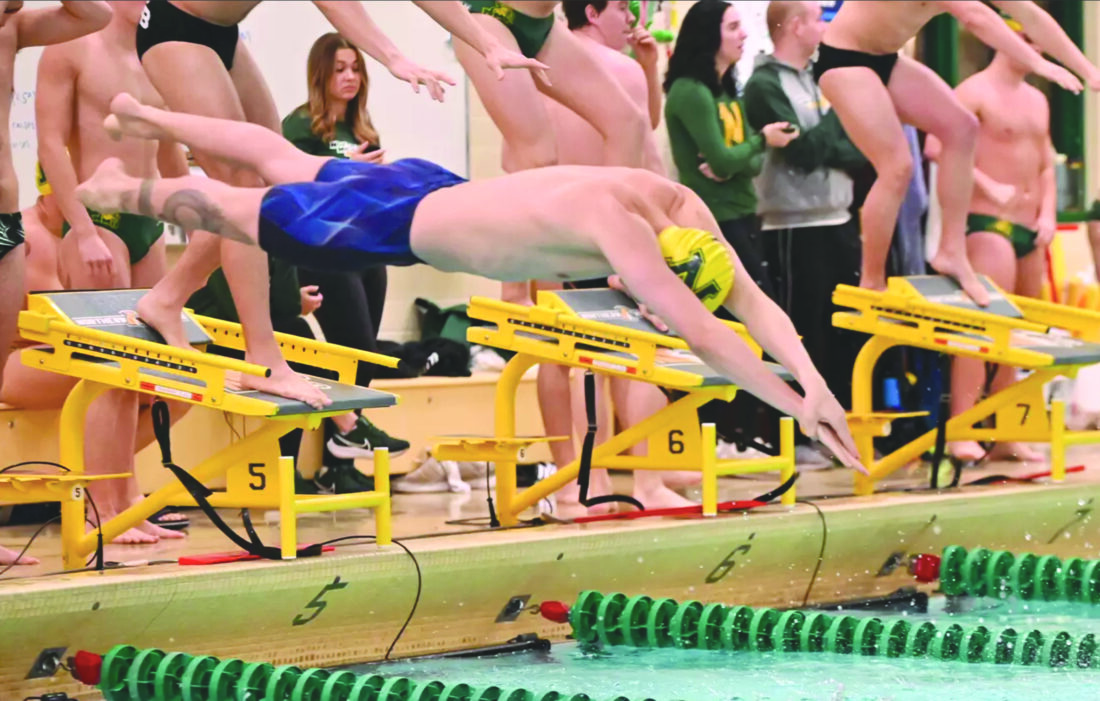 Northern Michigan University’s Gabriel Fulconi takes off from the blocks during a relay event of a past meet held at the PEIF pool in Marquette. (Photo courtesy NMU)