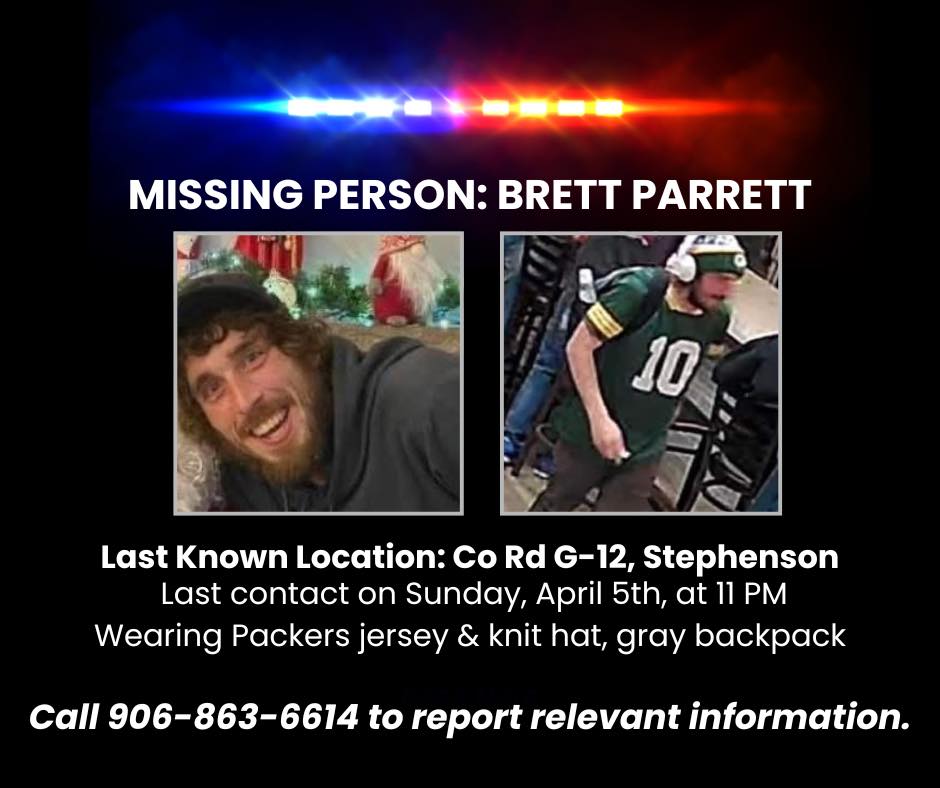 STEPHENSON — The Menominee County Sheriff’s Office is asking residents along west County Road G-12 (aka Co. Rd. 352) and adjacent roads in Stephenson to check their cameras and outbuildings for signs of missing person named Brett Parrett — a male in his mid 30s.