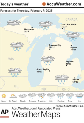 Marquette and vicinity: Today, sunny. Highs around 42. Southwest winds 5 to 10 mph with gusts up to 20 mph, becoming south in the afternoon. Tonight, partly cloudy in the evening, then becoming mostly cloudy. Lows around 25. South winds 5 to 10 mph.